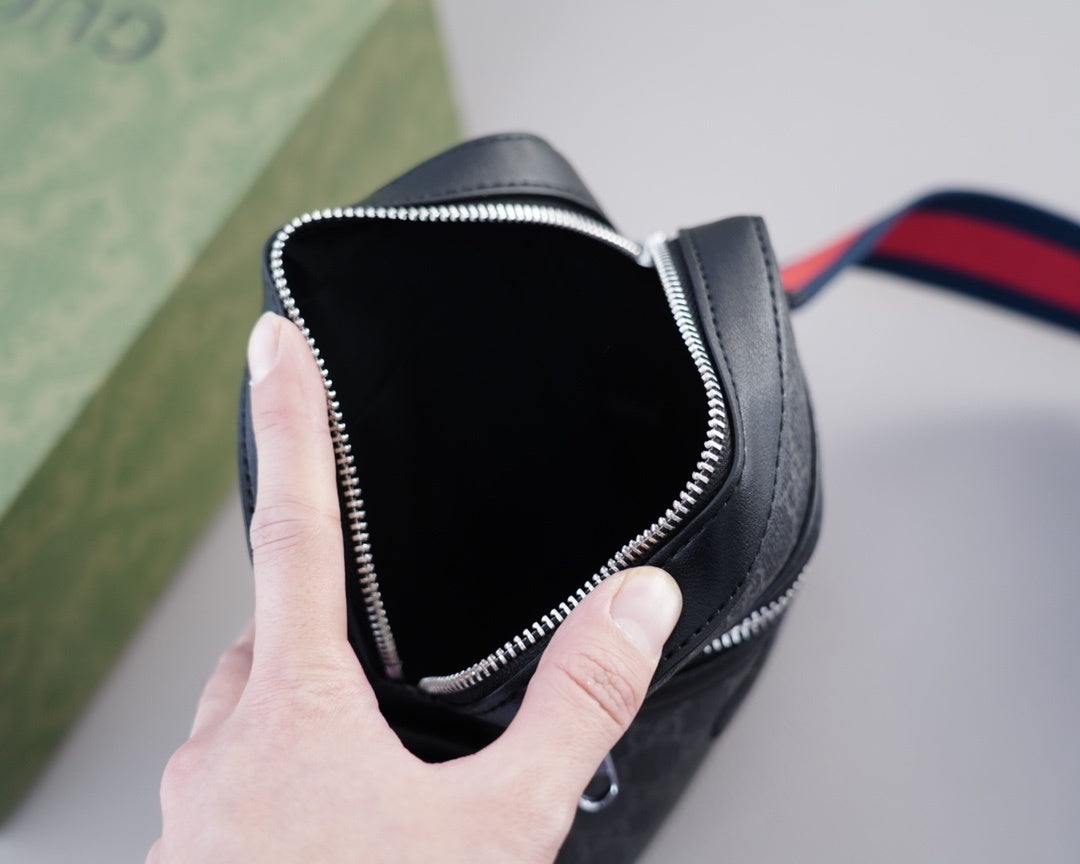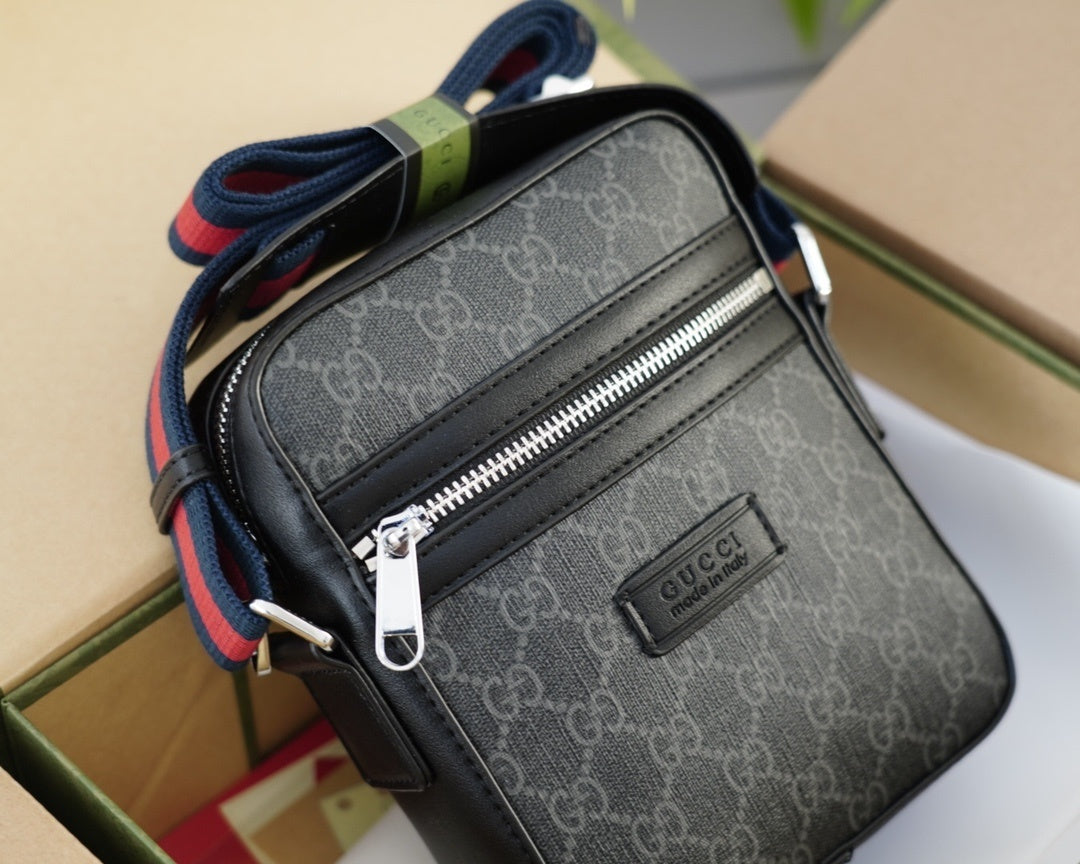 • Detalles: Bolsillo frontal con cierre metálico plateado, logo "GUCCI Made in Italy" en relieve